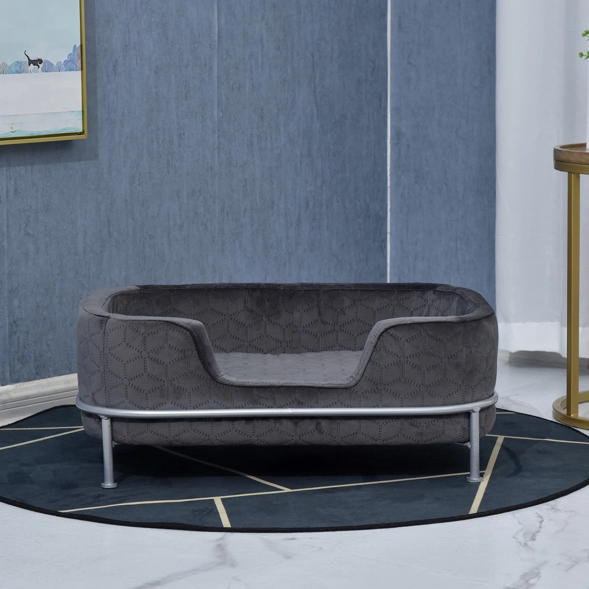 Je huisdier kan op deze hondenbank van PawHut perfect ontspannen en uitrusten. Het dikke kussen en de zachte stoffen bekleding met flanellen touch zorgen voor langdurig zit- of ligcomfort. Met de knusse bank kan je huisdier gezellig met jou naar een film kijken in de woonkamer of slapen in de slaapkamer. Je schattige viervoeter zal heel blij zijn met een eigen bank. Eigenschappen: · Huisdierenbank met modern design, bekleed met fluweel, ideaal voor kleine honden en katten · Het huisdiermeubel met zijn goudkleurige metalen onderstel zal in het oog springend bij jou thuis · Geschikt voor honden tot 11 kg · Een dik gewatteerd kussen met een zacht fluwelen oppervlak zorgt voor maximaal comfort · De hoes van het zitkussen is afneembaar en gemakkelijk schoon te maken · Eenvoudige montage noodzakelijk Technische gegevens: · Kleur: Grijs · Materiaal: Metaal, fluweel (100% polyester), schuimstof · Afmetingen: 63,5 L x 43 B x 24,5 H cm · Zitgrootte: 54 L x 34,5 B x 14,5 H cm · Draagvermogen: 11 kg · Artikelnummer: D04-157GY · Omvang van de levering: 1 x Huisdierenbank · Verzendbriefje: Geen verzending naar Nederlandse eilanden.