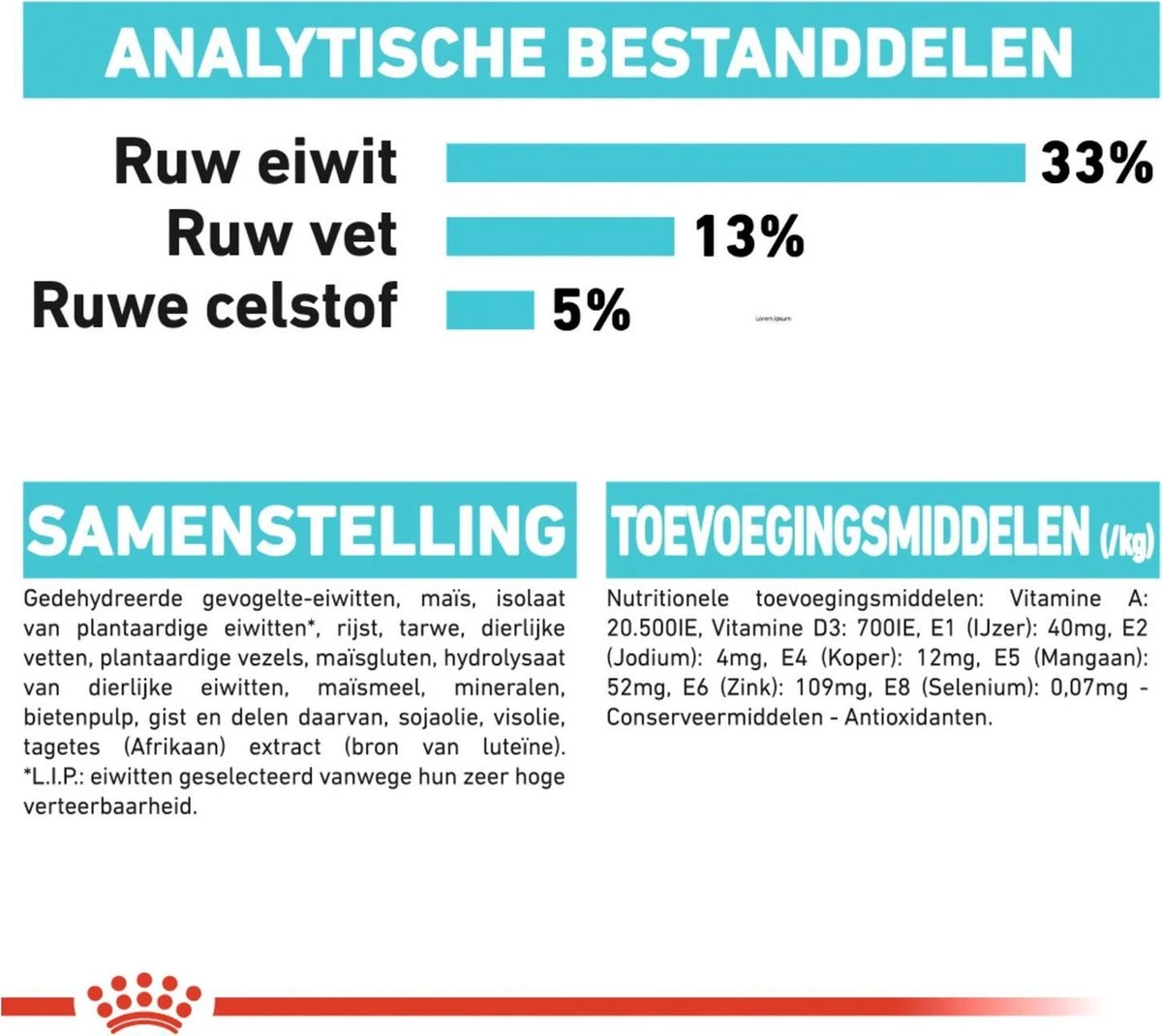 | Analytische bestandsdelen | Analyse: Ruw eiwit: 33.00% – Ruw vet: 13.00% – Ruwe as: 6.60% – Ruwe celstof: 5.00% |