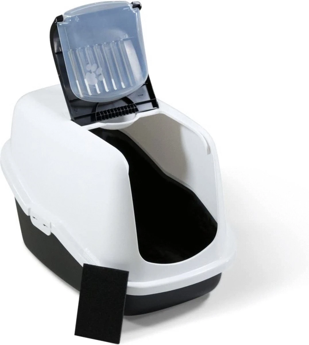 Een mooi gevormde kattenbak in een modieuze kleurstelling. Doordat het deurtje samen met het binnenste gedeelte van de bovenzijde in een handomdraai los te klikken is hoef je niet meer de complete bovenzijde van de onderbak los te maken om deze schoon te maken. Het los geklikte gedeelte kun je omhoog duwen zodat je er makkelijk bij kunt.